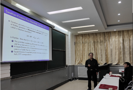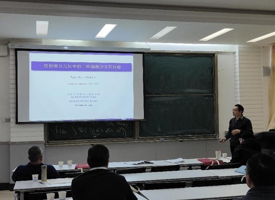 胡泽军针对仿射微分几何中的一些偏微分方程问题进行报告,在回顾仿射微分几何理论的基础上,概要总结了关于完备仿射超球面的分类研究和仿射极大超曲面的伯恩斯坦问题研究,最后介绍了他们近期取得的研究成果。