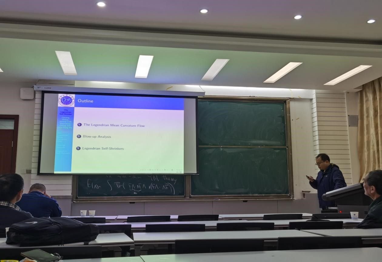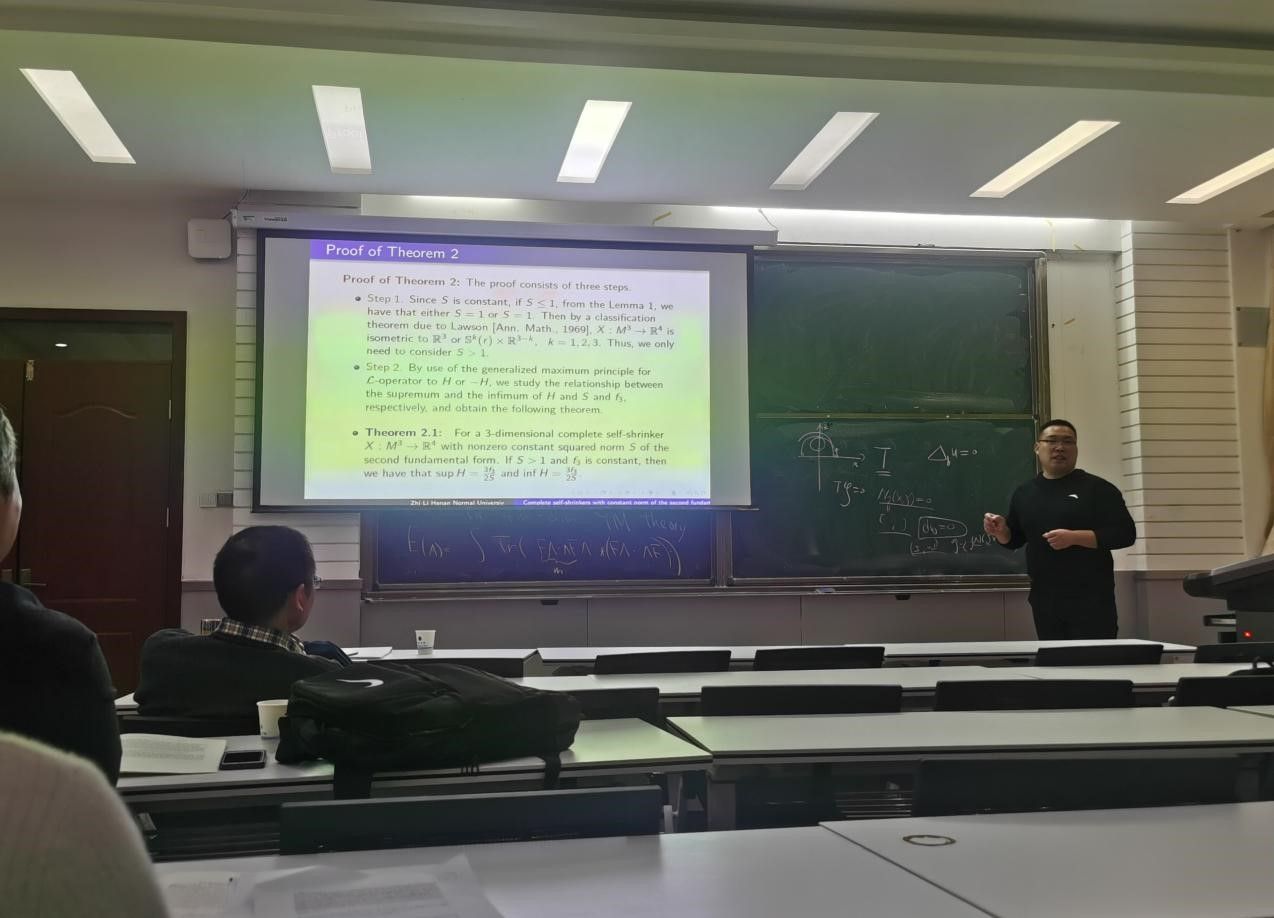 重庆理工大学张柳阳围绕“Legendrian Self-Shrinker”展开,主要介绍了 Legendrian 平均曲率流, 并利用 Huisken’s monotonicity formula,推导出它的self-shrinker,最后,他给出了几个Legendrian Self-Shrinkers 的例子。