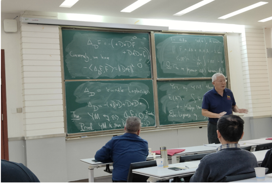 杨亦松围绕“拓扑类的调和表示”课题展开,他简要回顾了一些基本结果,包括 Eells-Sampson 定理、Hodge 理论、Yang-Mills 瞬时子对 Chern-Pontryagin 类的表示等。杨亦松特别强调这类问题与非线性分析、偏微分方程的联系。
