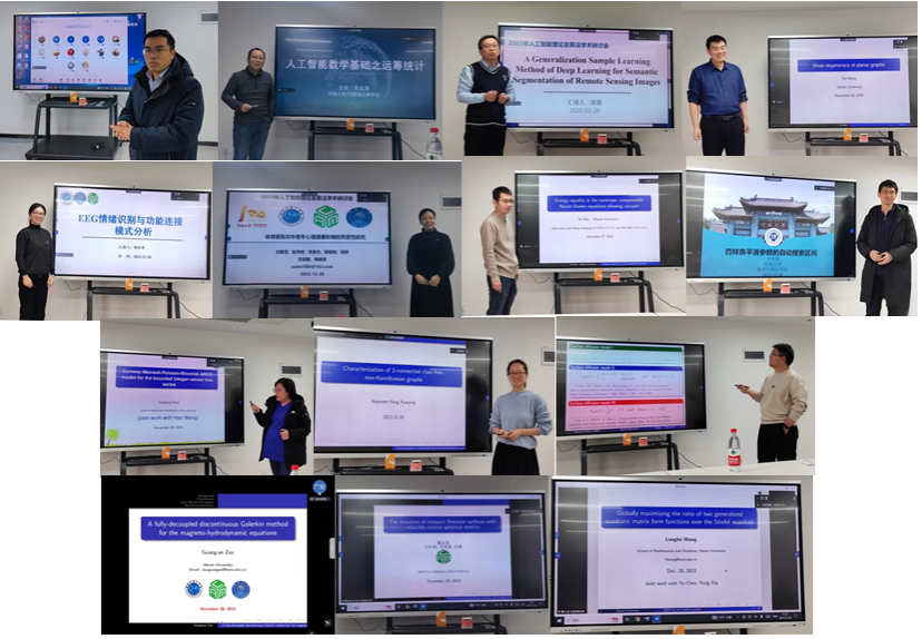 会议探讨的主题是人工智能理论及算法研究领域的国内外最新研究方向和研究成果,线下肖运海、郑晨、王涛、杨利军、苏丽敏、叶嵎林、李哲源、陈花萍、杨晓静和黄琼敖,线上邹广安、魏志强和王龙飞等带来了十三场精彩的学术报告,会议内容涵盖人工智能数学基础之运筹统计、基于深度学习的遥感图像语义分割、图论及其应用、基于脑电信号的情绪识别、因果机器学习及其应用、统计计算、Navier-Stokes方程及其应用、magneto-hydrodynamic方程及其应用、Cahn-Hilliard方程及其应用、有界整数值时间序列分析及其应用、黎曼流形及其应用、Stiefel流形及其应用等。