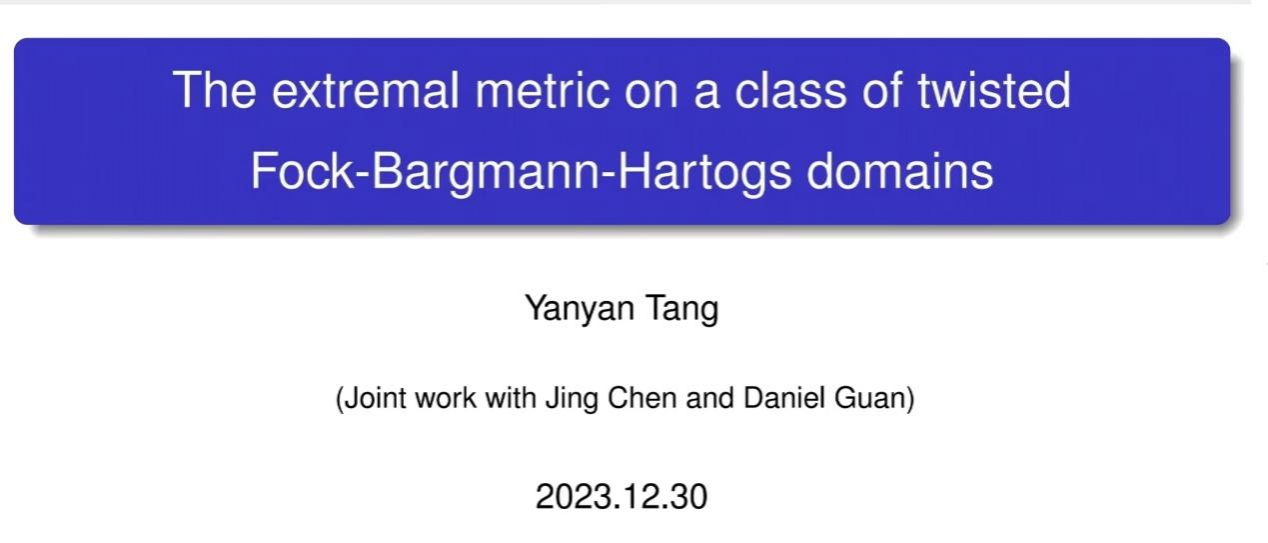 唐言言针对一类无界拟凸域,首先证明其是type III 的余齐性一流形,然后用复几何中的余齐性一方法,与合作者研究了该类域上 Kahler-Einstein 度量和Extremal 度量的表达式,并得到全纯双截曲率的一个简洁表示。最后给出三维情形下的一个具体实例,得到Bergman度量下的ricci 曲率。