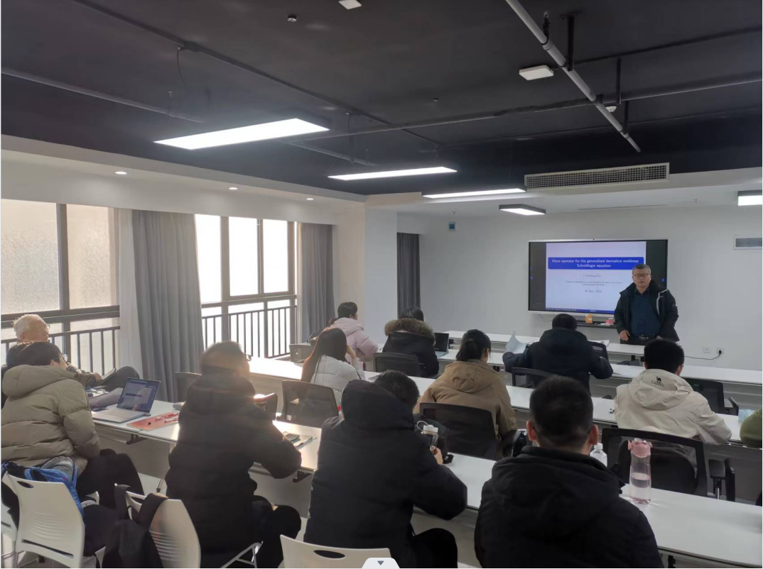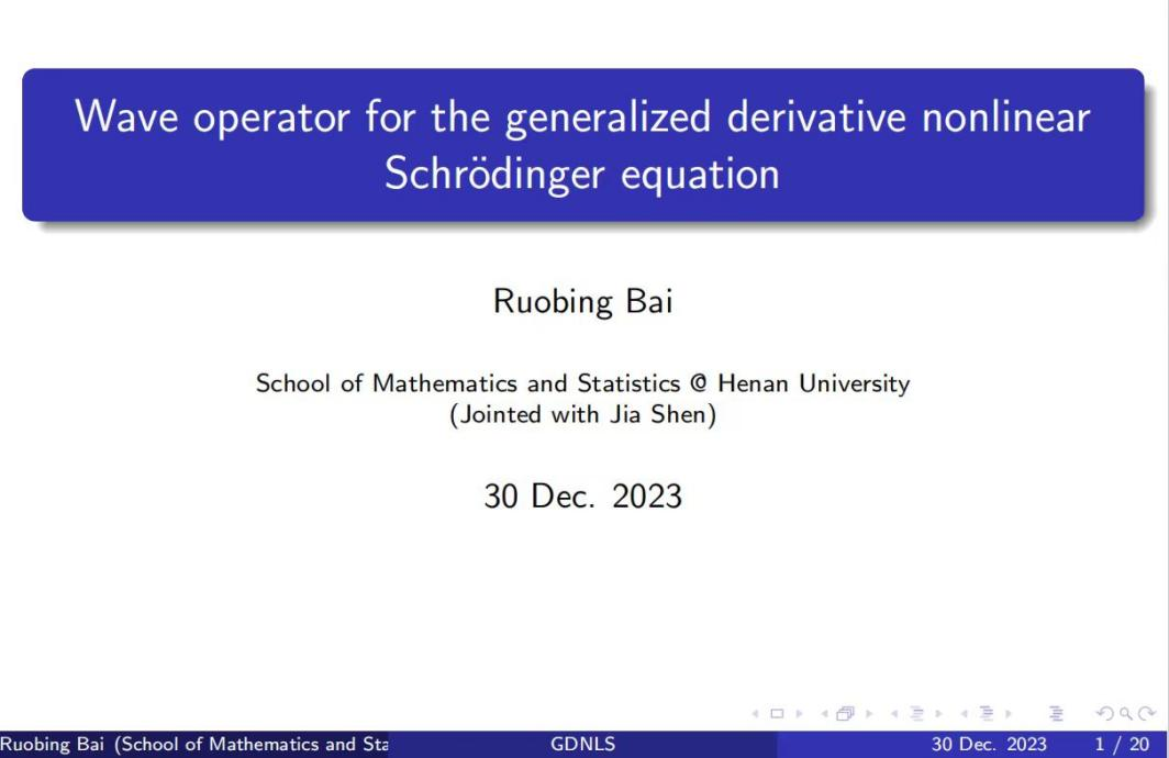 白若冰介绍了广义导数非线性薛定谔方程的波算子存在性。该问题的困难在于如何克服一阶的导数损失。一方面,通过gauge变换改变了非线性项的结构,从而获得非共振性质。另一方面,通过normal form变换,可以转移高频部分的二阶导数,克服导数损失问题。该研究可能会促进该方程的大初值散射研究,是与天津大学申佳老师合作共同完成的工作。