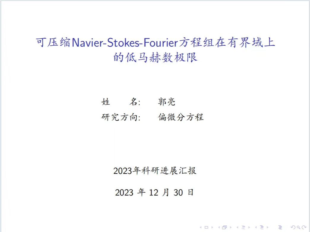 郭亮讲述了可压缩Navier-Stokes-Fourier方程组在有界域上的低马赫数极限。首先,考虑能量方程,使用声波算子的谱分析方法,利用热传导作用使得声波算子产生的边界层能提供阻尼作用,证明了速度的可压部分收敛到零,进而得到不可压极限。然后,介绍了关于考虑熵方程的情形,并尝试改进能量方程下得到的结果。