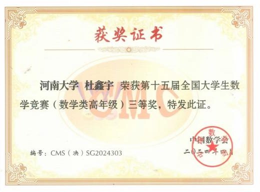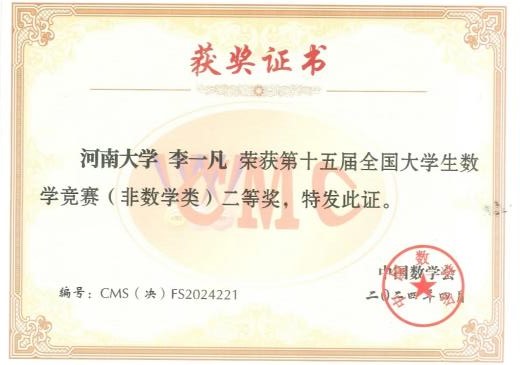 李望龙以河南省第一名的好成绩获得专业组(高年级组)二等奖;杨桂颜、韦萍萍、代维嘉、杜鑫宇获得专业组(高年级组)三等奖;巩启超获得专业组(低年级组)三等奖;李一凡获得非专业组二等奖;郑广豪、屠玉涛、周柄材获得非专业组三等奖,河南省数学会获评“优秀赛区组织奖”;一本道无码