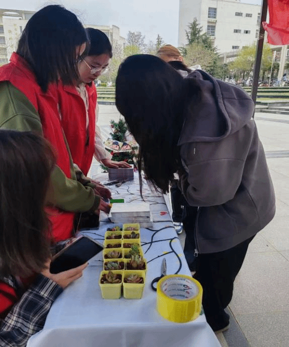 志愿者在下沉广场,向同学们宣传活动开展方式,号召大家积极参与。同学们通过给留守儿童写明信片,用废弃物品给留守儿童做手工艺品,领养绿植三种形式参与活动,为留守儿童提供情感关怀,鼓励他们阳光开朗、健康成长。同时,同学们在摊位的爱心树上按上手印,传递爱心。