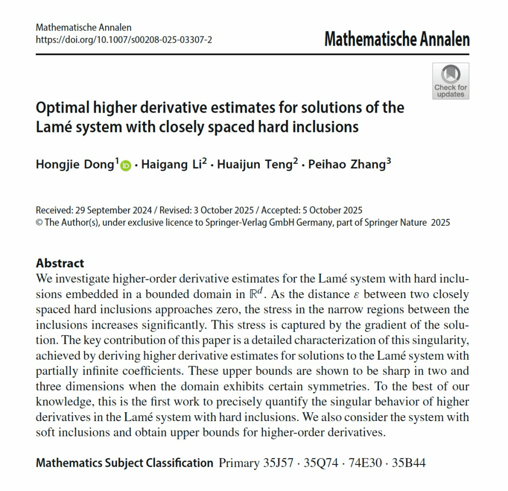 近日,我院博士后张培豪与美国布朗大学董弘桀教授、北京师范大学李海刚教授等合作者在偏微分方程与材料科学交叉研究领域取得新进展,相关成果以《Optimal higher derivative estimates for solutions of the Lamé system with closely spaced hard inclusions》为题,发表于学术期刊《Mathematische Annalen》。该研究聚焦于含有紧密相邻硬夹杂的Lamé系统,建立了系统解的高阶导数的最优估计。