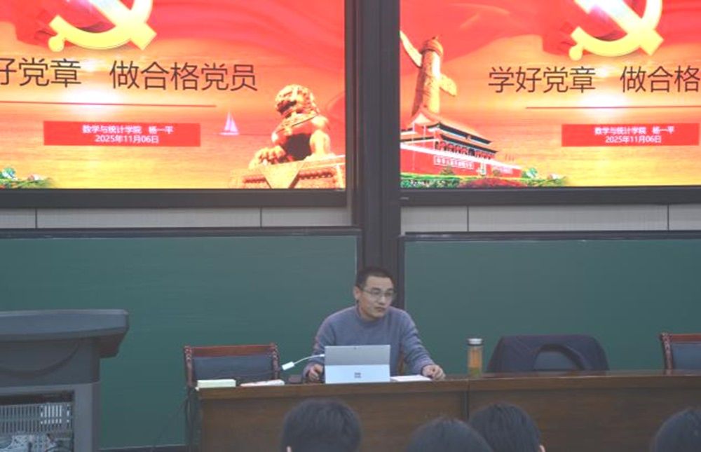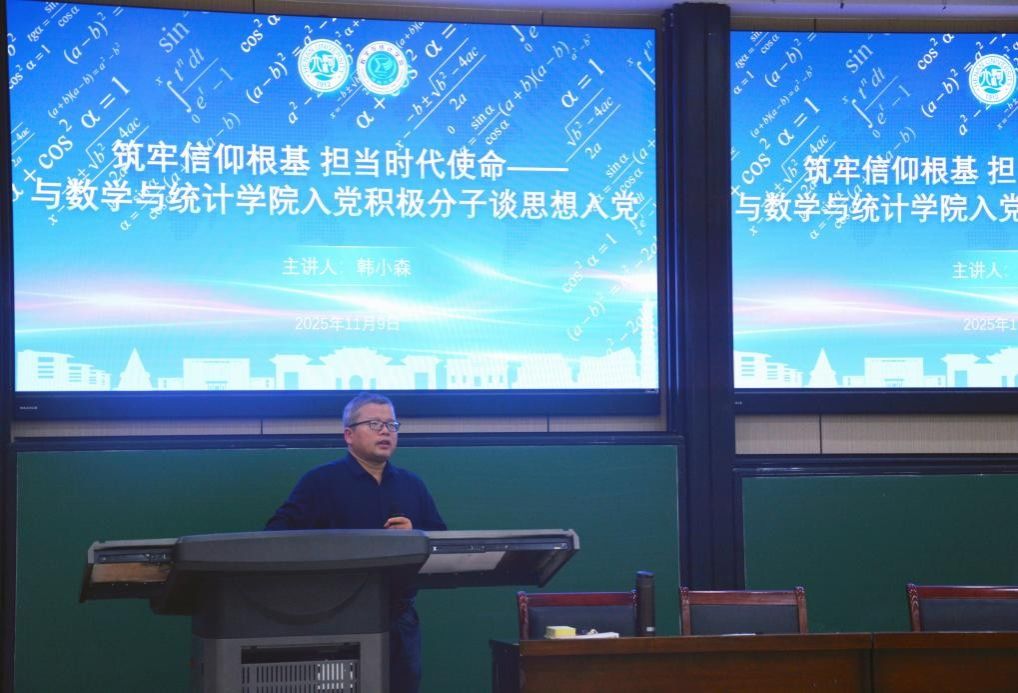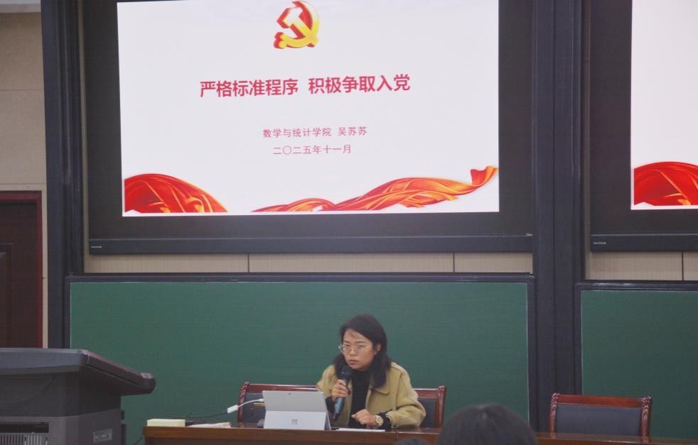 入党积极分子谈思想入党”为题,围绕“时代召唤与青年责任”“数学思维与党的理论的内在联系”等四个板块展开,既阐释了党的性质、初心使命,也结合数统学子的专业特点,鼓励大家将数学模型、数据方法融入服务国家发展的实践中。他鼓励在座学员,以此次培训为契机,将理论学习与专业素养相融合,成长为兼具坚定信念与扎实学识的新时代青年,以数统人的智慧为强国建设、民族复兴贡献力量!