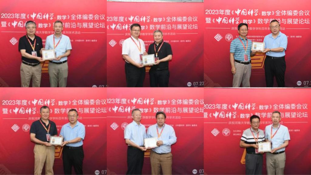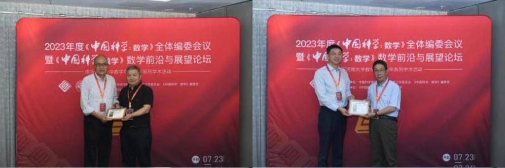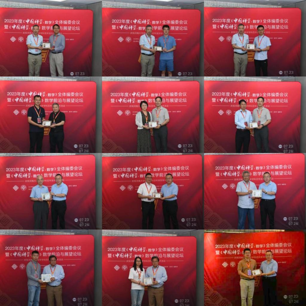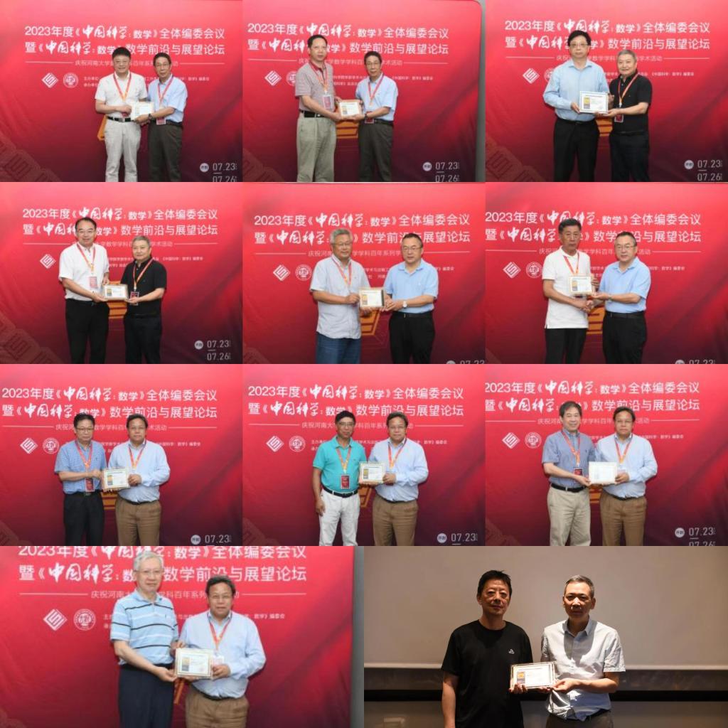 全体编委会上颁发了《中国科学:数学》期刊中文版第三、四届和英文版第五 、六届“优秀论文奖“,颁发2019-2022年度 “编委杰出贡献奖”和 “编委优秀服务奖”,公布了两届优秀审稿人名单。此外,席南华院士还向《中国科学:数学》期刊新任副主编和编委颁发聘书。